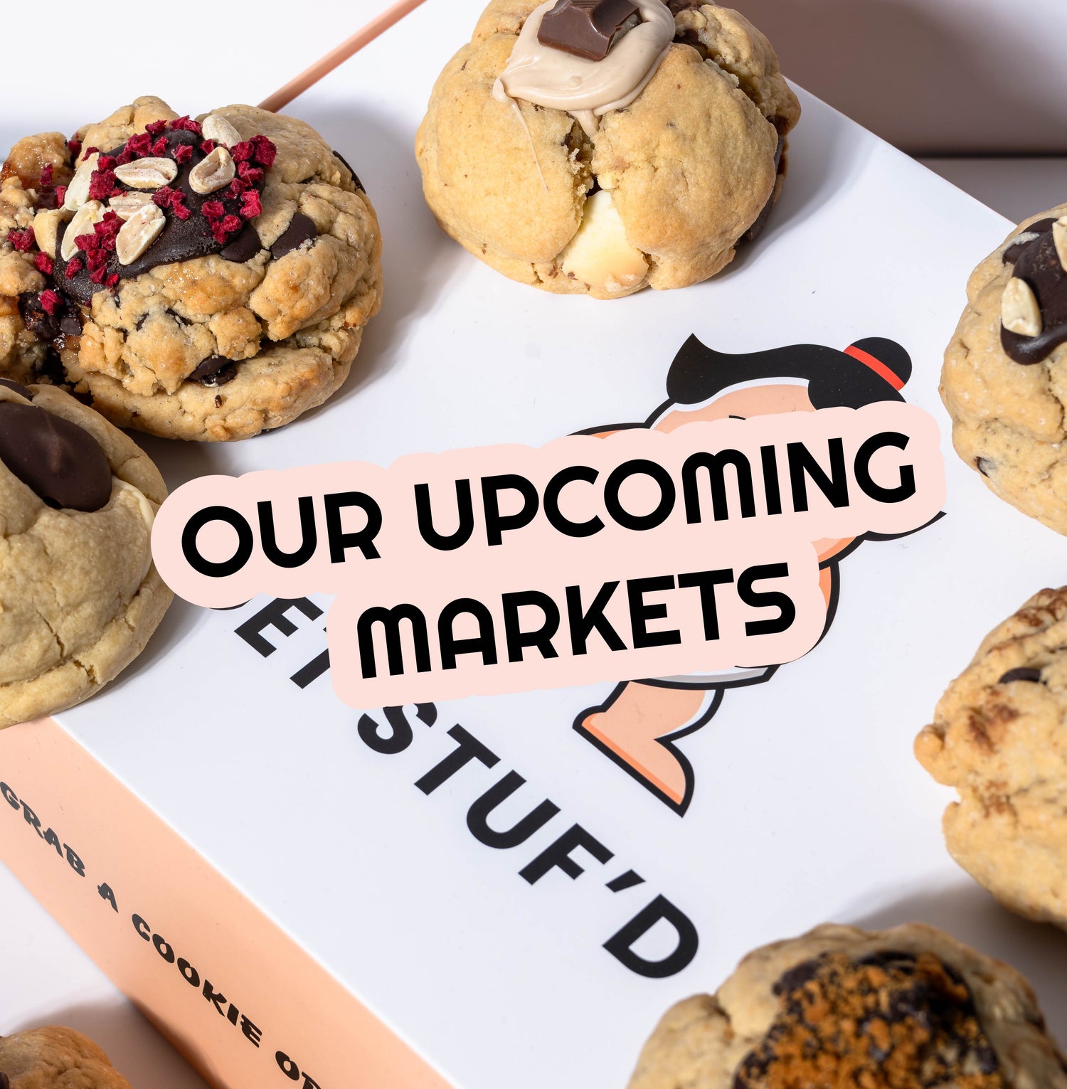 Ready to get Stuf'd in person? We’re hitting up local markets with all your favourite loaded cookies and more! It’s your chance to grab a fresh batch straight from the source, chat with the team, and get a sneak peek of new flavours.